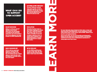 Billed as a “way to engage students on the topic of access to research,” the initiative forwards Open Access as a principle for students to consider and support. I love this idea, and am interested to see if the initiative can help librarians and educators stimulate student interest in open publishing and accessible research. My least favorite part of information literacy instruction is telling students that their access to scholarly resources is temporary, and based almost totally on their active (aka $$-based) association with a college or university. The Open Access movement should be a natural sell from a student perspective (if not necessarily an easy one). Campaign resources range from a student-directed blog to links for various brochures and publications, a few pages of which I’ve included in this post. As you can see, they are extremely well done.